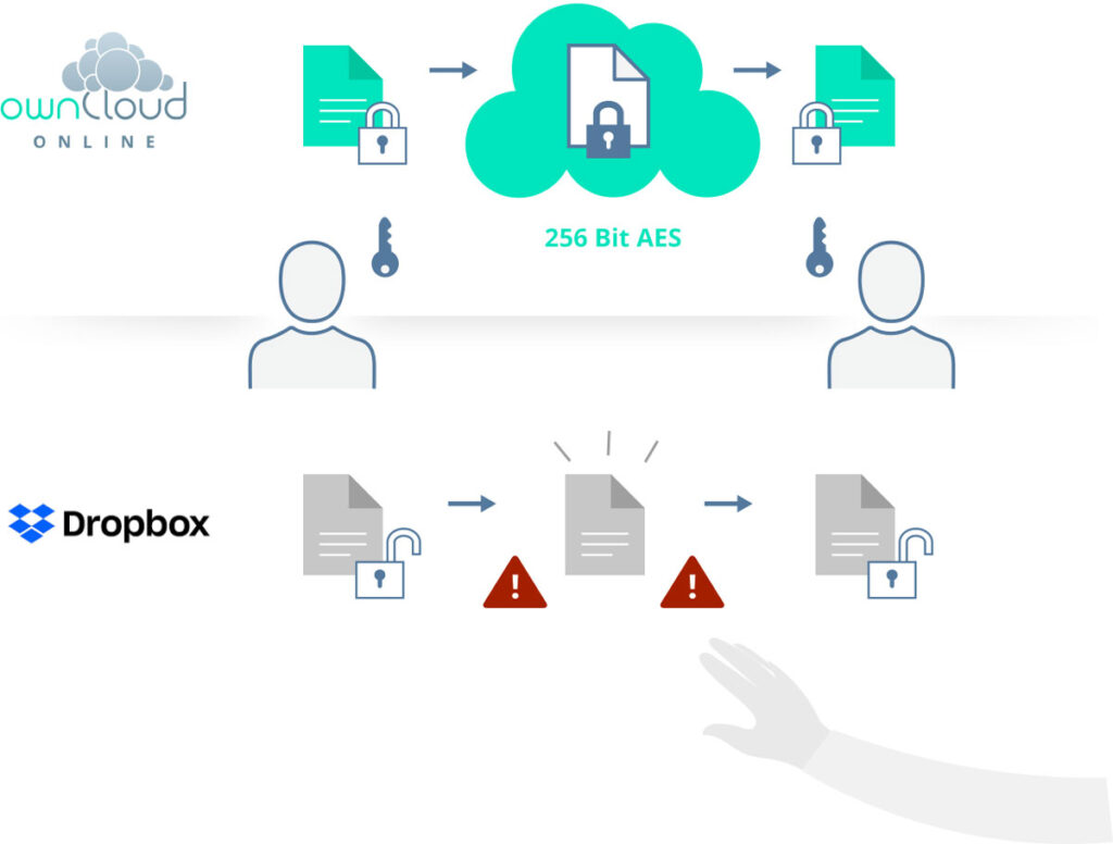 Despite encryption Dropbox has full access to your data. Why ownCloud.online is more secure explained in detail.