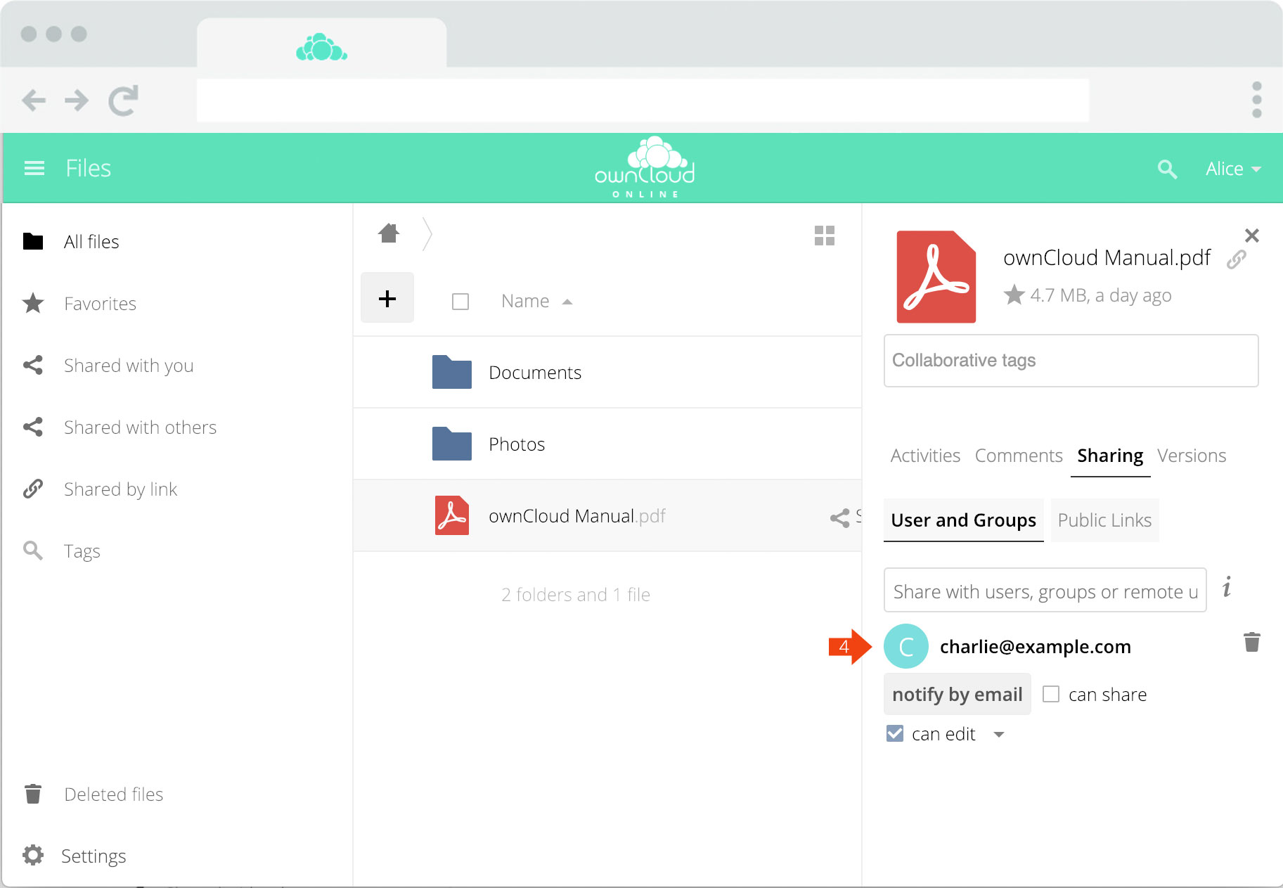 Alice klickt auf das Sharing-Icon (1), um eine Datei/Ordner mit Charlie zu teilen.